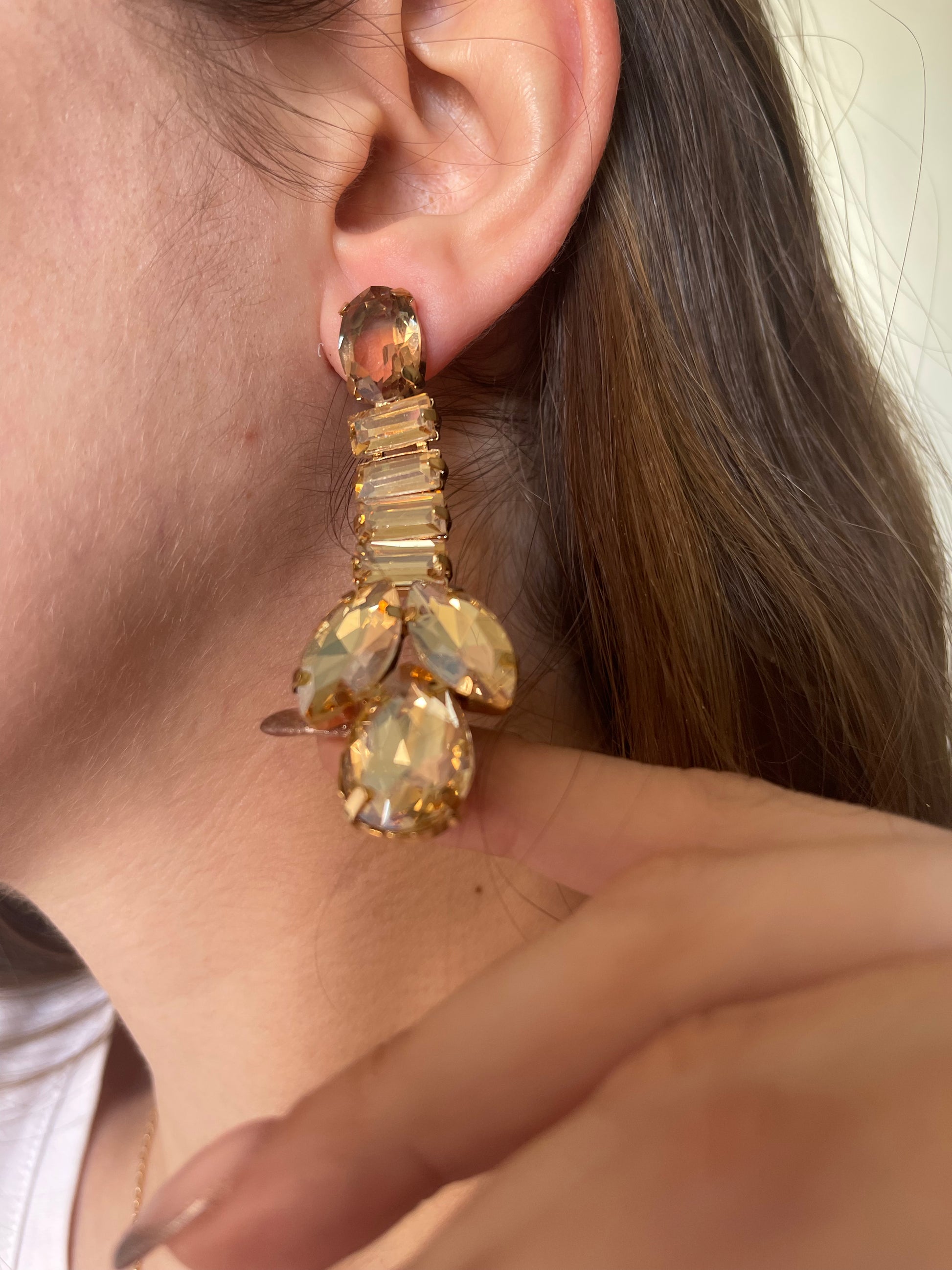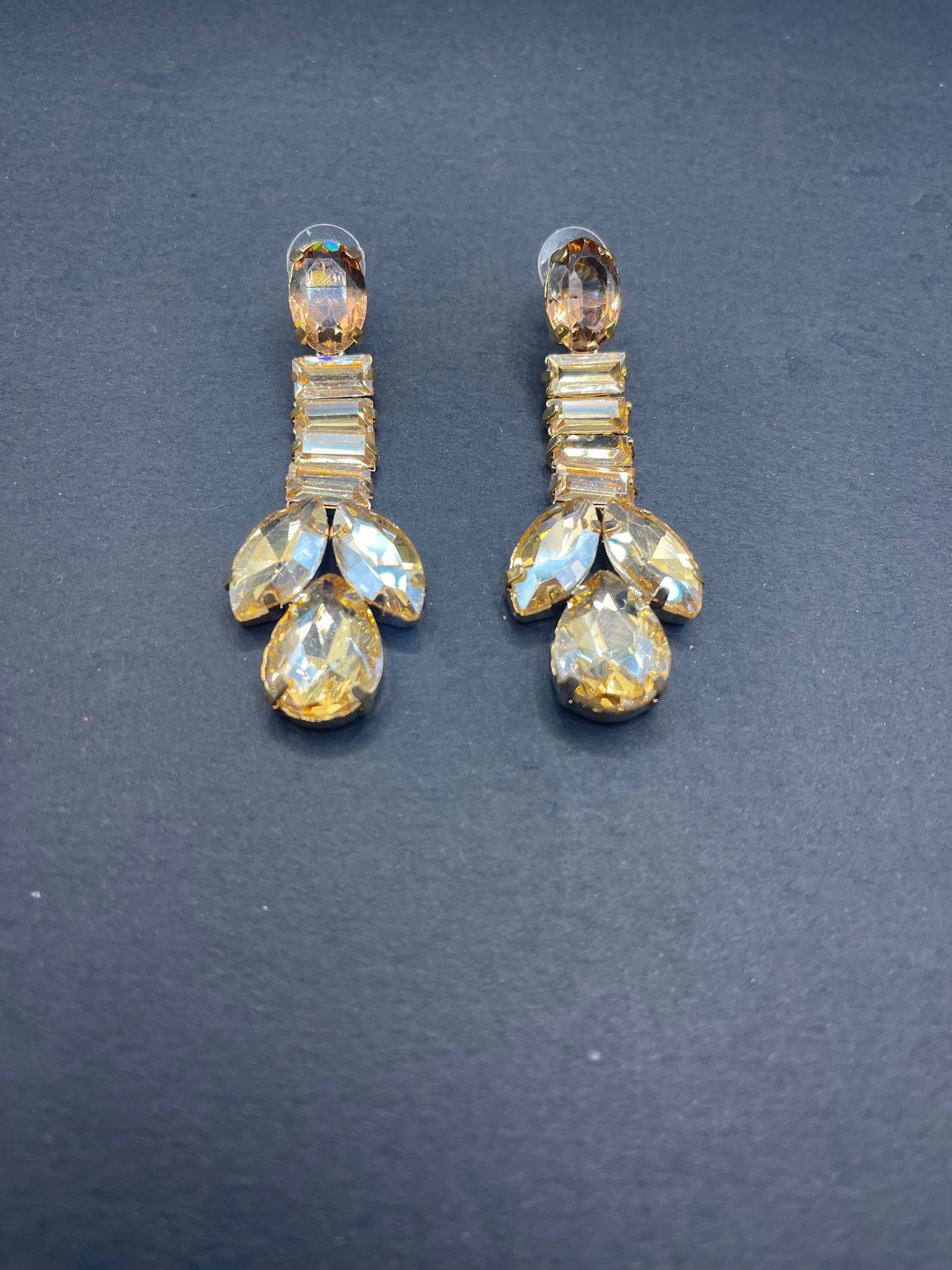 Dripping in opulence, these stunning gold-toned earrings feature a captivating mix of baguette-cut and teardrop-shaped crystals. The intricate design creates an elongated, elegant silhouette that exudes vintage charm and modern sophistication.