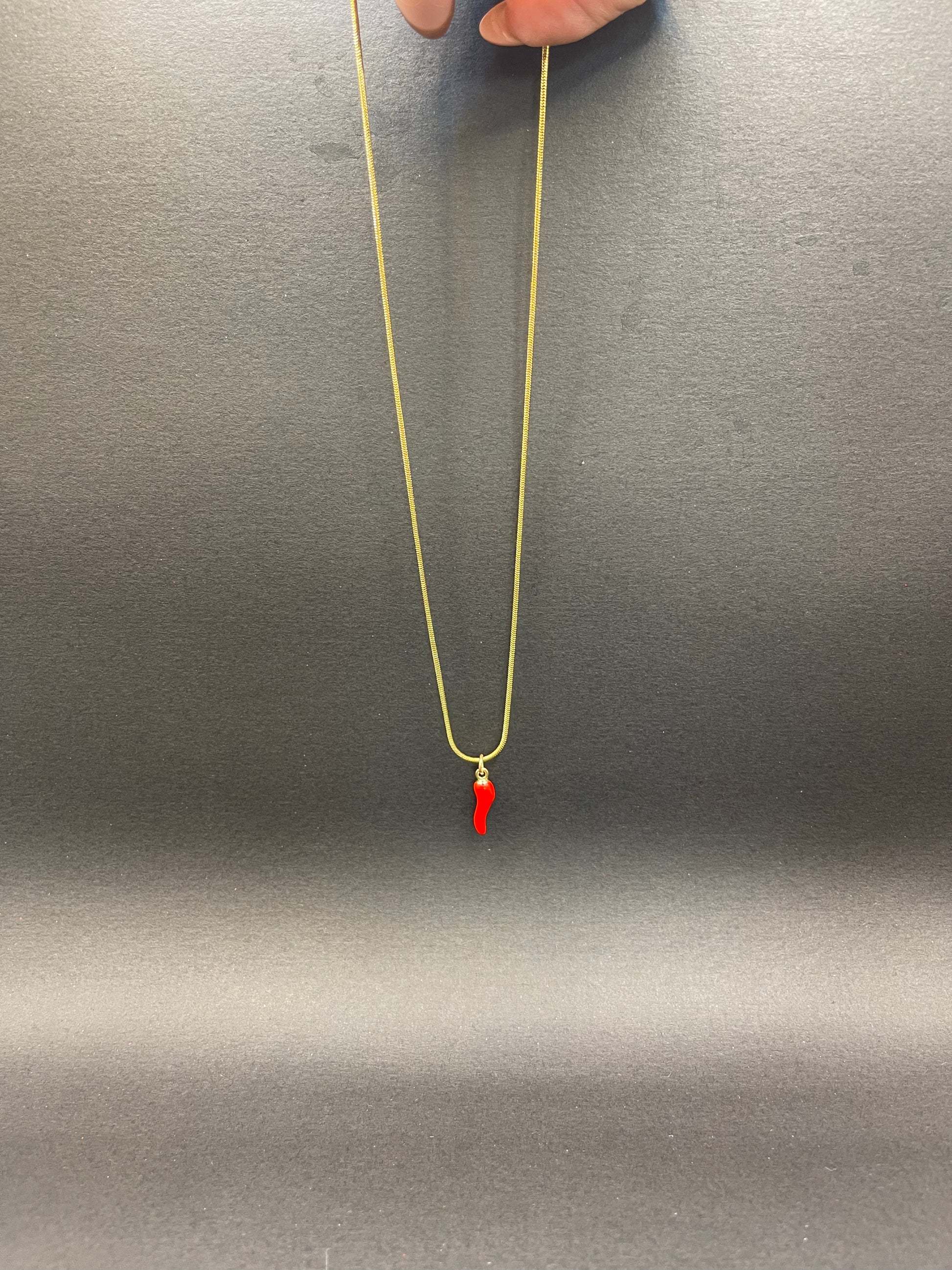 This elegant gold-tone necklace features a stainless steel chain, known for its durability and tarnish resistance, paired with a striking red Cornicello (Italian horn) pendant. The Cornicello, or "little horn," is a traditional Italian amulet believed to ward off the "Malocchio" (evil eye) and bring good luck, protection, and prosperity.