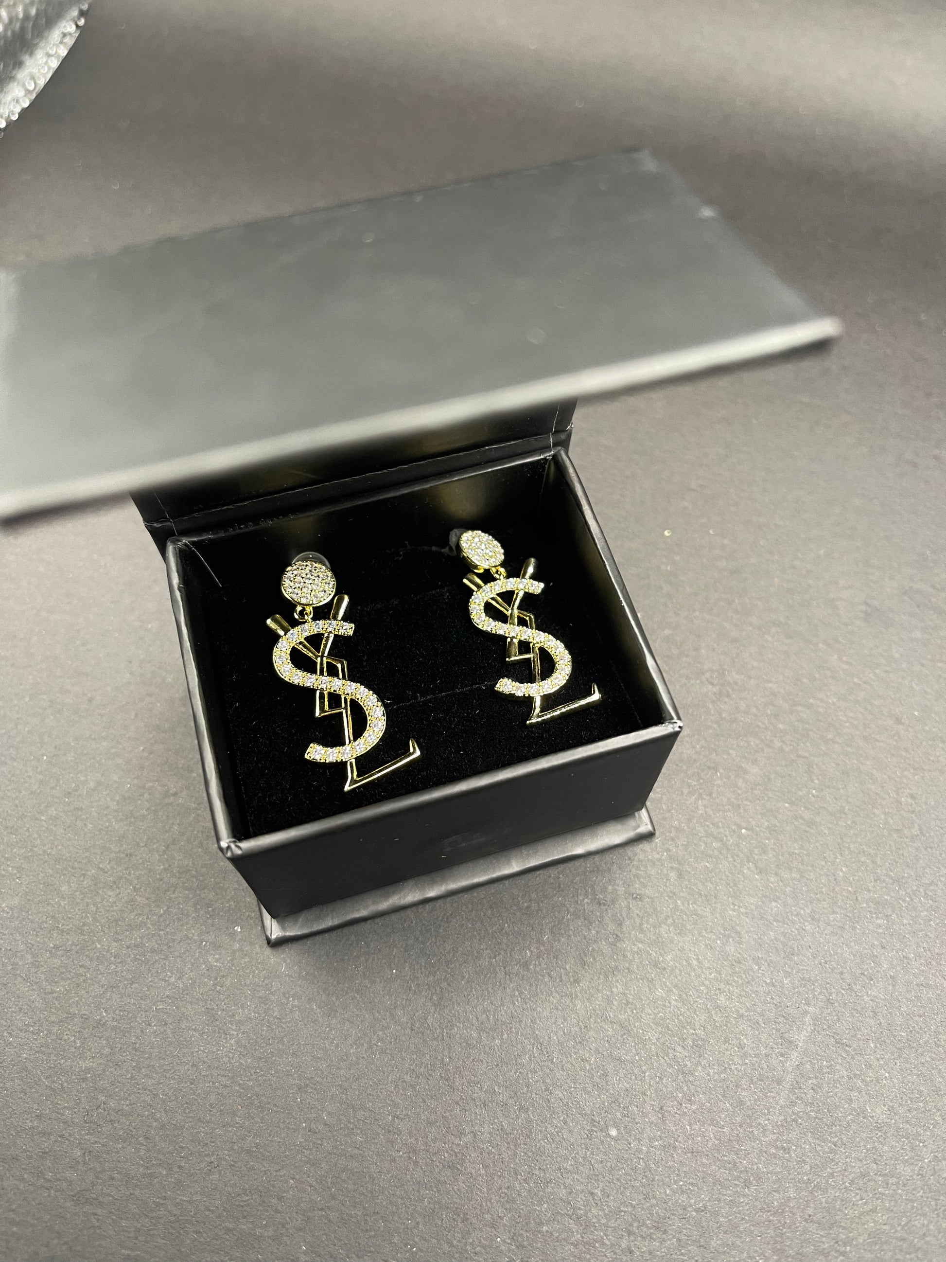Make a bold statement with these exquisite gold-tone drop earrings, featuring a striking interlocking monogram design encrusted with shimmering crystals. Inspired by high-fashion elegance.