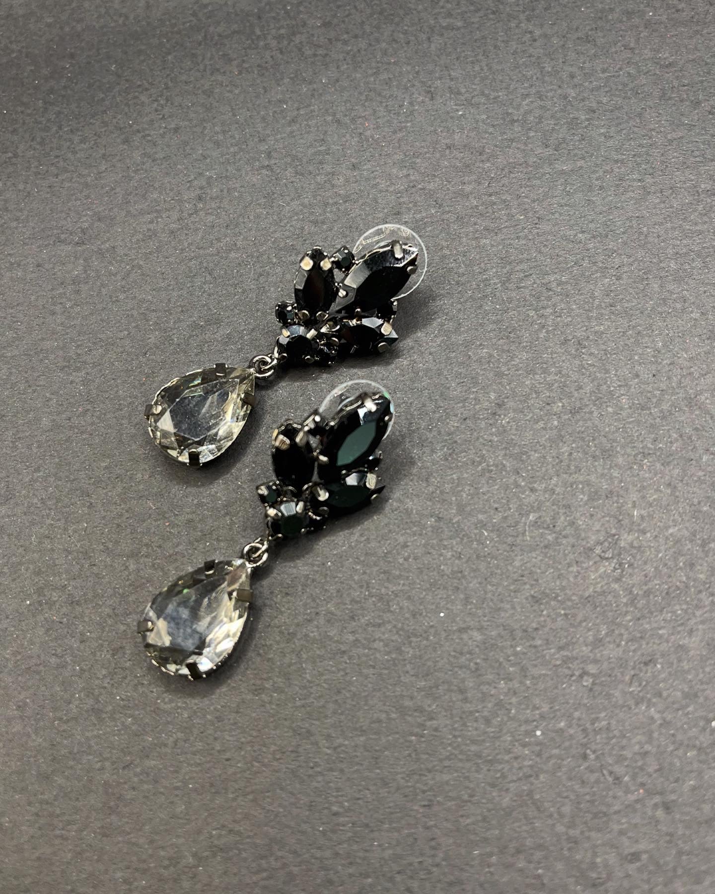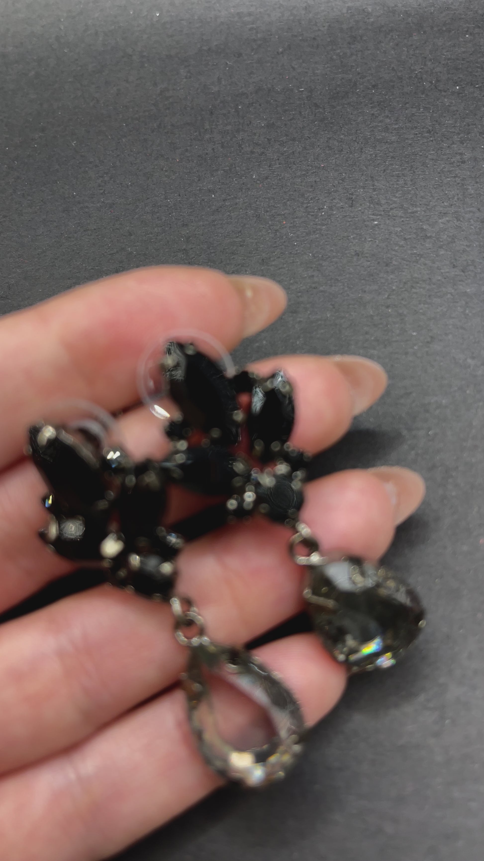 Dramatic and elegant, these stainless steel earrings feature a striking mix of deep black and crystal-clear stones. The intricate floral-inspired design at the top is adorned with faceted black gems, leading to a dazzling teardrop crystal that catches the light with every movement. Set against a dark metal base, these earrings exude a bold yet sophisticated charm.